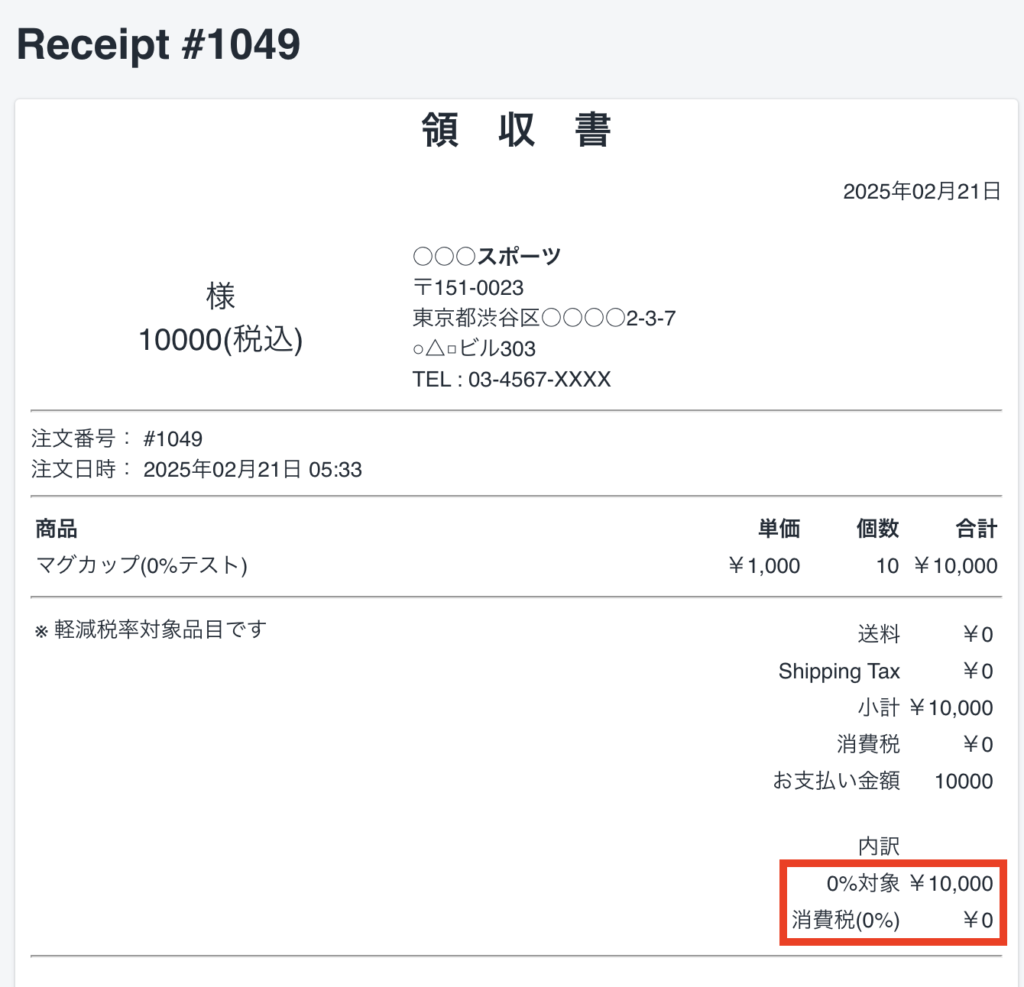 ストアに登録している商品の税率がそのまま領収書に適用されます。